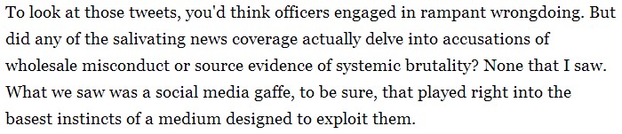 The author is right, none of the established news organizations that deigned to cover the protests delved into accusations of wholesale misconduct or systemic brutality. However, that’s not – as she suggests – evidence that such widespread, systemic conduct did not occur.
