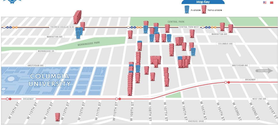 Visitors to the CoSo Apartments website immediately see an interactive color-coded map of the Upper West Side and Columbia University, with icons denoting where each of Orbach’s 73 buildings are in relation to the campus. Clicking on a building icon will tell a visitor how far from Columbia University the building is using public transportation or walking.